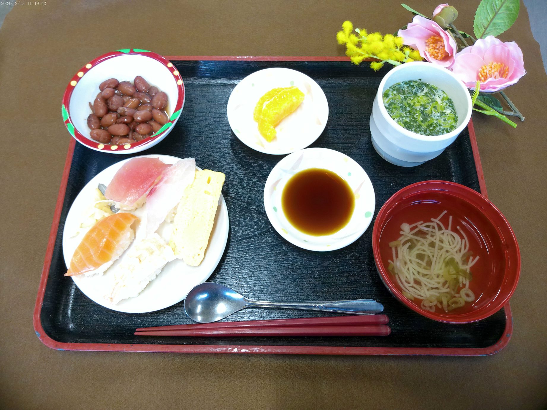 12月 誕生日会メニュー 2024.12.18 トピック・写真 12月13日、昼食時に誕生日会メニューを提供しました。★握り寿司★茶碗蒸し★煮豆★素麺のすまし汁★オレンジ★梅酒利用者様の多くが握り寿司を楽しみにされており、おかわり分の握り寿司も全て食べられていました。 前へ 一覧へ戻る 次へ