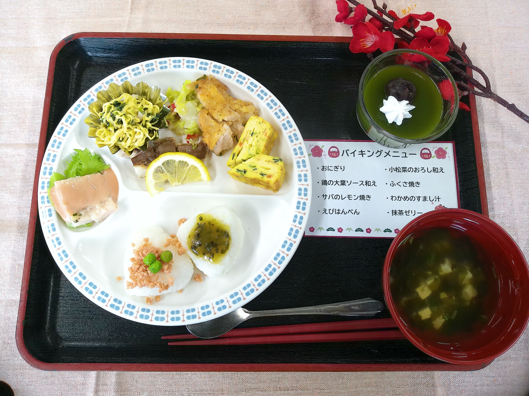 1月 バイキングメニュー 2025.1.27 トピック・写真 1月24日の昼食時にバイキングメニューを提供しました。バイキングメニュー時は、初めて食べるものもあり新鮮で楽しみにしているなどの声が聞かれました。《お品書き》★おにぎり★鶏の大葉ソース和え★サバのレモン焼き★えびはんぺん★小松菜のおろし和え★ふくさ焼き★わかめのすまし汁★抹茶ゼリー 前へ 一覧へ戻る 次へ