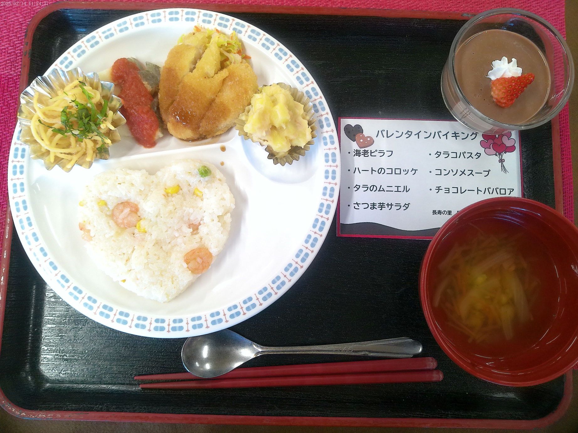 2月 バレンタインバイキングメニュー🍫 2025.2.17 トピック・写真 2月14日の昼食時にバレンタインバイキングメニューを提供しました。ハートのコロッケとさつま芋のサラダが人気でした。《お品書き》 ★海老ピラフ ★ハートのコロッケ ★タラのムニエル ★さつま芋のサラダ ★タラコパスタ ★コンソメスープ ★チョコレートババロア 前へ 一覧へ戻る 次へ