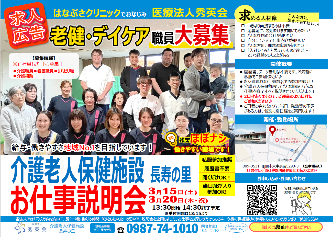 3月 お仕事説明会 開催 2025.3.10 最新情報 皆さん こんにちは!秀英会 採用担当です🌸日に日に厳しい寒さも和らぎ、春の陽気を感じられるようになりました。長寿の里では、地域の医療・福祉・介護の需要が増しておりさらに需要を満たすため、お仕事説明会を開催し、新しい仲間を募集することにしました。ライフスタイルにあった勤務をご希望の方は、是非、ご参加ください(*^-^*)皆様のお越しをお待ちしております🍀 前へ 一覧へ戻る 次へ