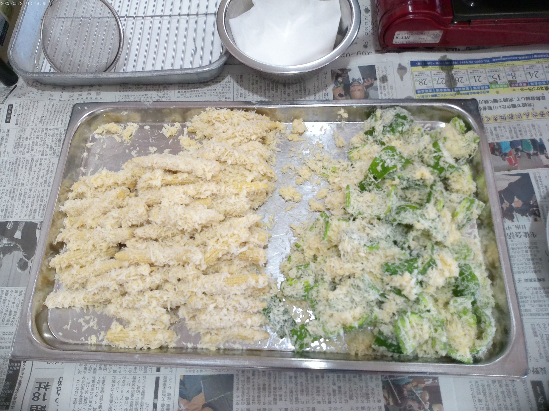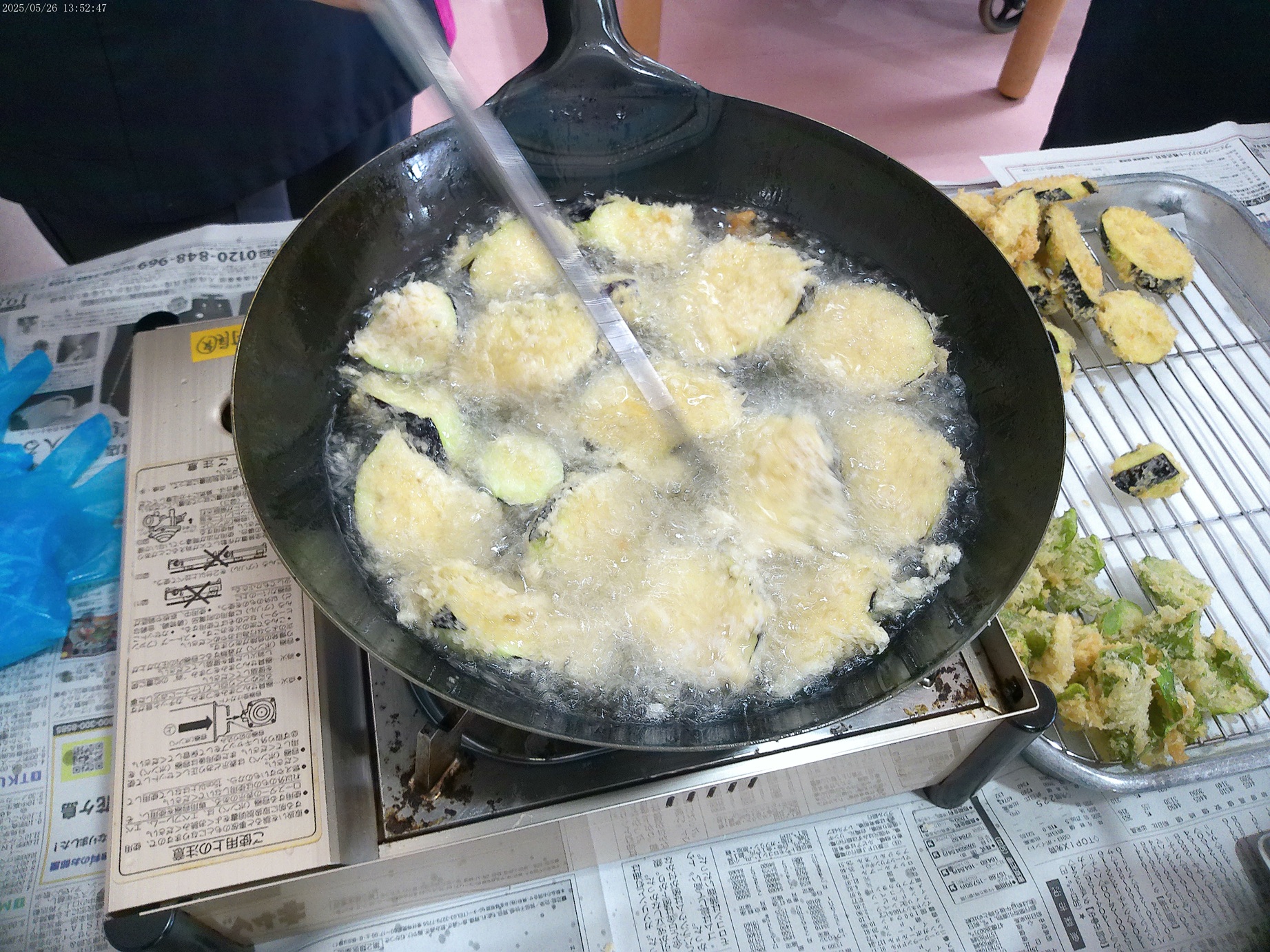 5月 入所喫茶 2025.5.27 トピック・写真 5月26日、入所喫茶を行いました。串揚げ(なす・ピーマン・じゃがいも・ヤングコーン・魚肉ソーセージ)、ミニケーキ、焼き鳥、ジュースを提供しました。実演で行い、揚げたてを食べていただきました。おかわりを希望される方も多かったです。じゃがいもや魚肉ソーセージが人気でした! 前へ 一覧へ戻る 次へ
