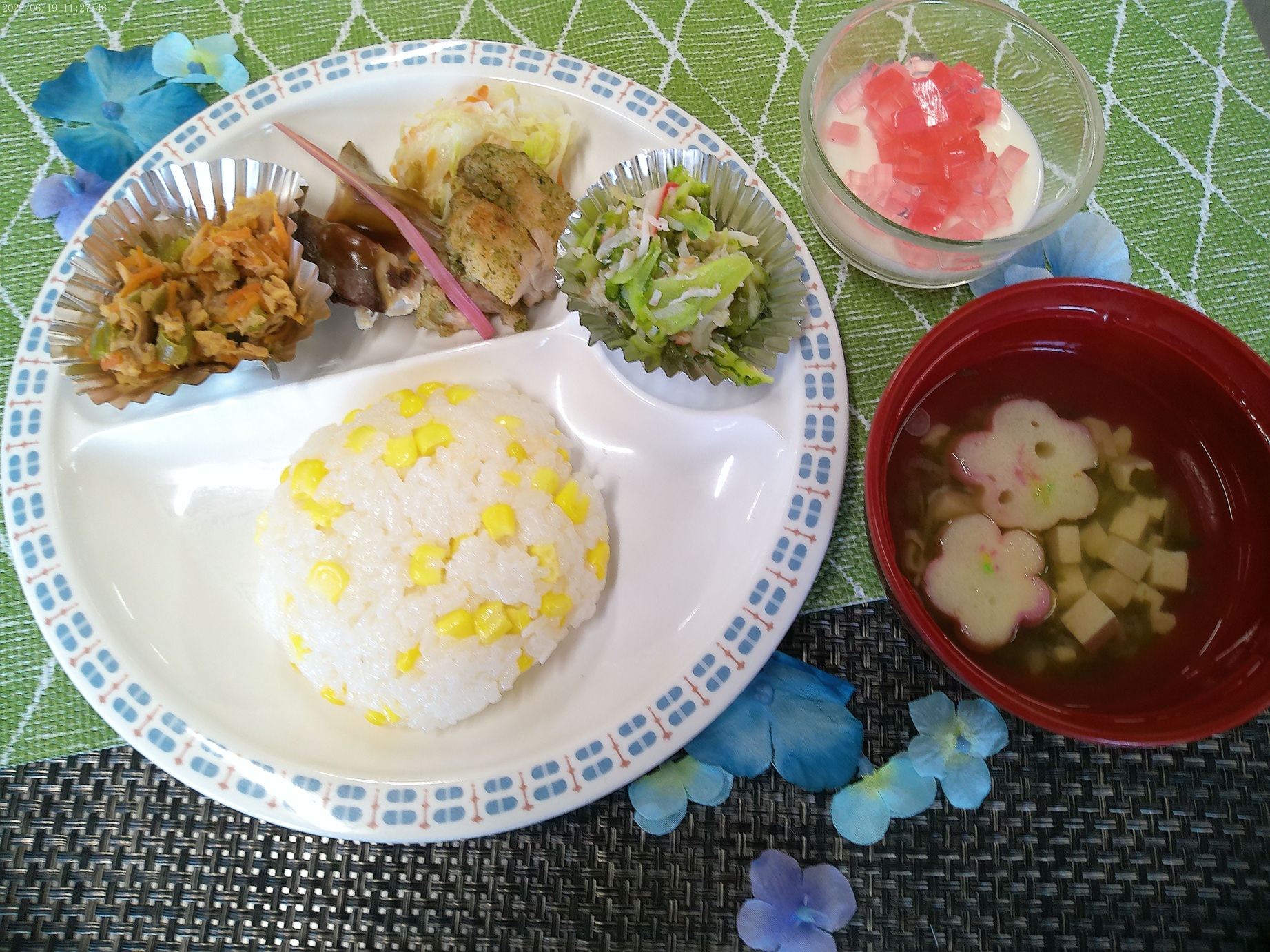 6月 バイキングメニュー 2025.6.24 トピック・写真 6月19日、昼食時にバイキングメニューを提供しました。利用者様からは、全部おいしかったや紫陽花ゼリーの色がきれいといった声が聞かれました。紫陽花ゼリーは、牛乳寒天の上に赤と白の寒天をサイコロ状に切ったものを乗せて紫陽花に見立ててみました! 《お品書き》 ★とうもろこしご飯 ★のり塩唐揚げ ★アジの蒲焼風 ★ゴーヤの酢の物 ★ピーマンとツナの炒め物 ★小花麩のすまし汁 ★紫陽花ゼリー 前へ 一覧へ戻る 次へ