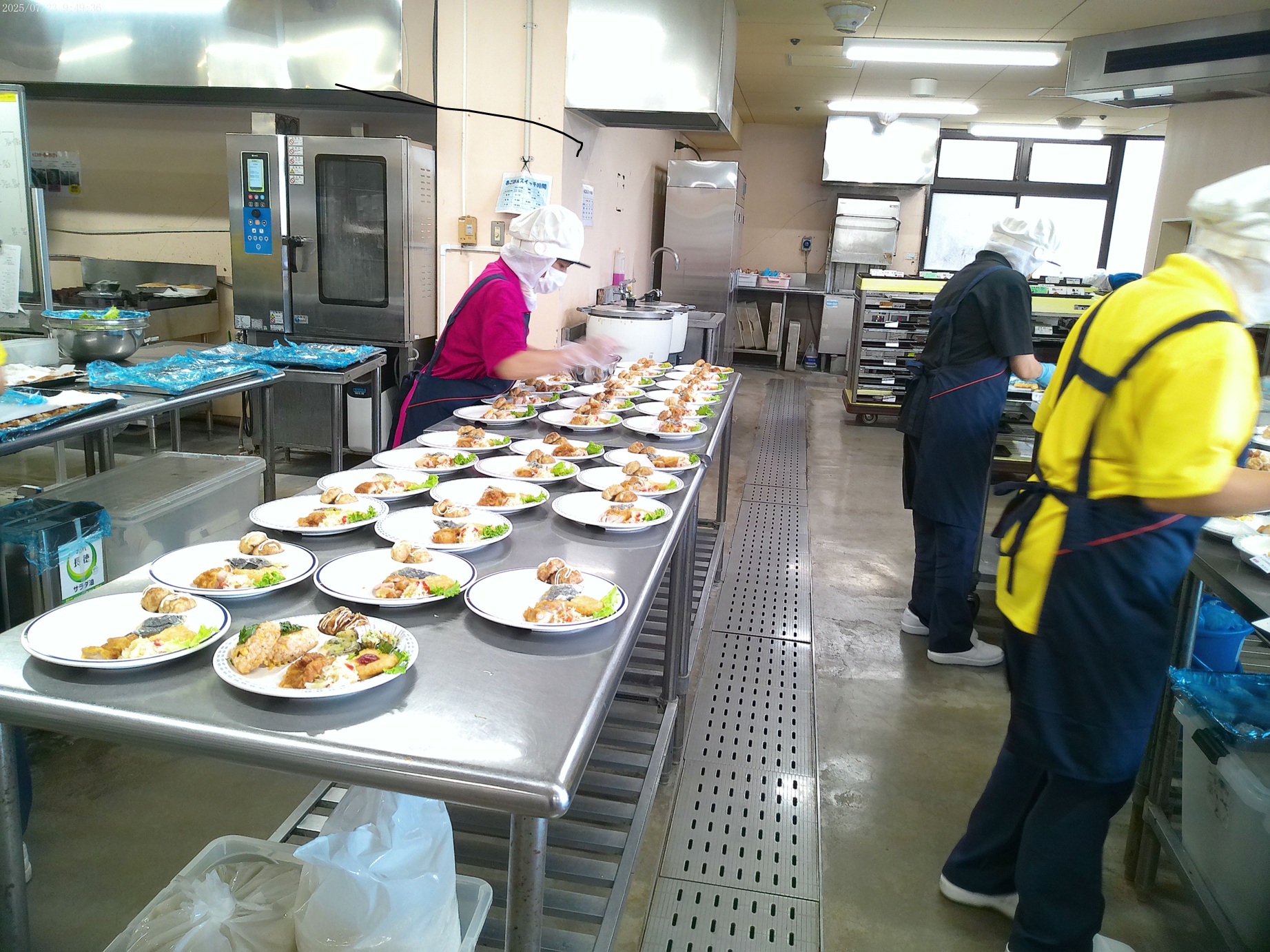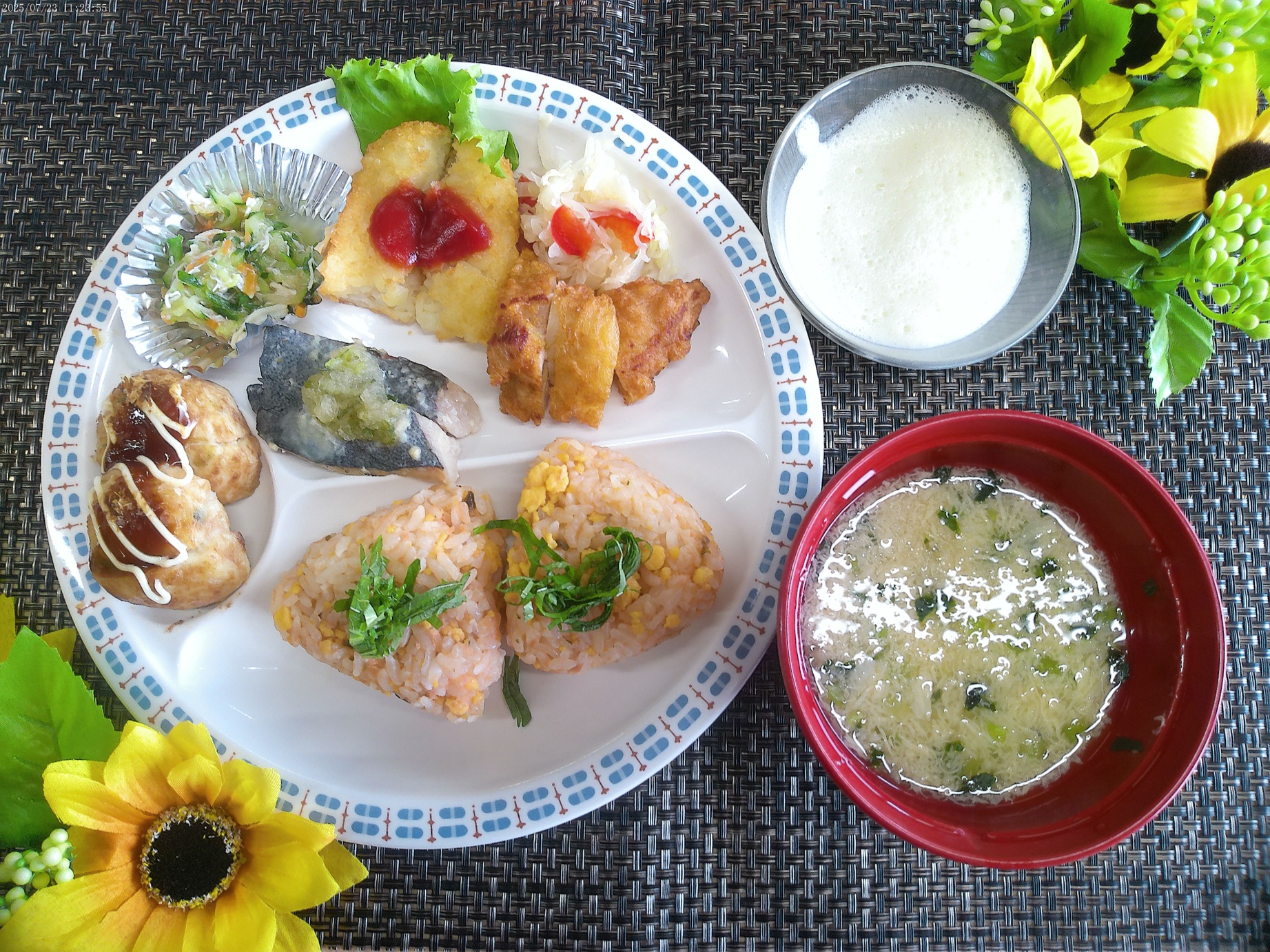 7月 夏祭りバイキングメニュー 2025.7.24 トピック・写真 7月23日、昼食時に夏祭りバイキングメニューを提供しました。 《お品書き》 ★鮭塩昆布おにぎり ★カレー風味唐揚げ ★シイラのムニエル ★たこ焼き ★ハッシュドポテト ★胡瓜の梅和え ★青梗菜と卵スープ ★ビール風ゼリーたこ焼きは、柔らかいタイプで高齢者の方でも食べやすいものです。ビール風ゼリーは、下の層をりんごゼリーにし、豆乳風味の泡を上にのせてビールにみたてました。利用者様からは、鮭塩昆布おにぎりが味付けも丁度良くおいしいやビール風ゼリーは見た目がちゃんとビールに見えるといった声が聞かれました。 前へ 一覧へ戻る 次へ