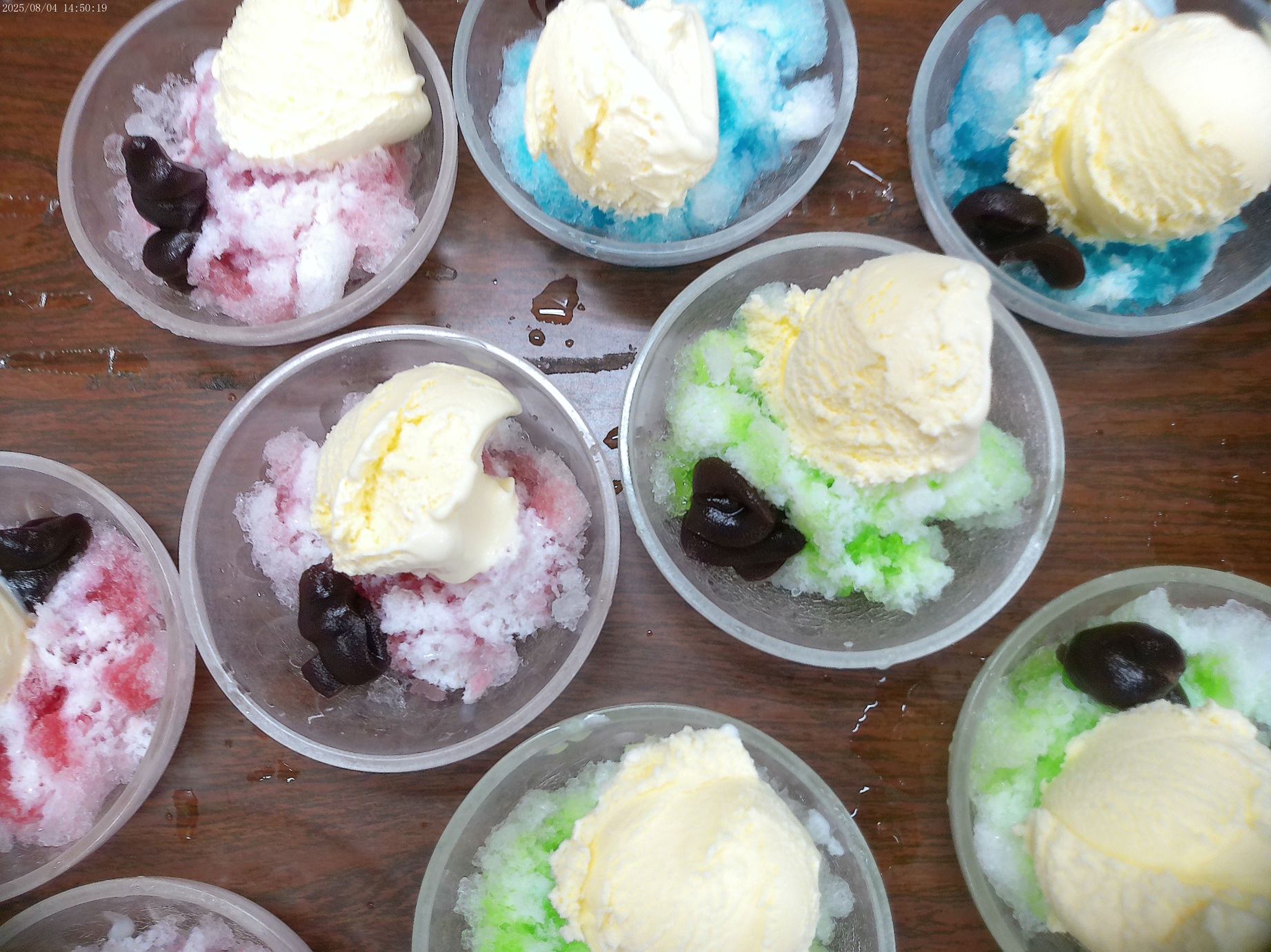 8月 入所喫茶 2025.8.28 トピック・写真 8月25日、入所喫茶を行いました。今月の入所喫茶のメイン料理は、「かき氷」でした。その外にも、芋天、焼き鳥、ジュースを提供しました。かき氷は、いちご・メロン・ブルーハワイの3種類、トッピングとしてバニラアイス、練乳、あんこをのせました。冷たくておいしいなど多くの利用者様より好評でした。おかわりを希望される方も多くいらっしゃいました。 前へ 一覧へ戻る 次へ