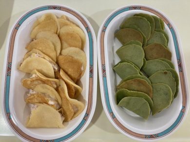 10月 入所喫茶 2025.11.7 トピック・写真 10月27日、入所喫茶を行いました。今月のメインは、「ミニクレープ」でした。生地は、プレーンと抹茶の2種類。具材は、ツナマヨコーン、あんこホイップ、チョコバナナの3種類を用意しました。甘いものが好きな方が多く、ホイップクリームが入ったクレープがおいしいかったという声が多く聞かれました。 一覧へ戻る 次へ