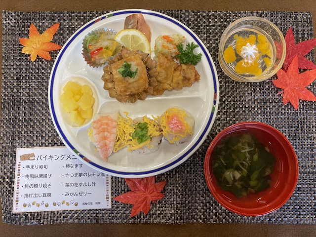11月 バイキングメニュー 2025.11.28 トピック・写真 11月26日、昼食時にバイキングメニューを提供しました。 《お品書き》 ★手まり寿司 ★梅風味唐揚げ ★鮭の照り焼き ★揚げ出し豆腐 ★柿なます ★さつま芋のレモン煮 ★菜の花のすまし汁 ★みかんゼリー手まり寿司が好評でした。見た目もきれいで見た目からおいしそうといった声や品数がいっぱいでうれしいといった声が聞かれました。 前へ 一覧へ戻る 次へ