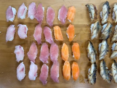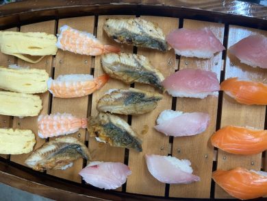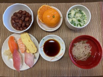 12月 誕生日会メニュー 2025.12.17 トピック・写真 12月12日、昼食時に誕生日会メニューを提供しました。 ★握り寿司 ★茶碗蒸し ★煮豆 ★素麺のすまし汁 ★みかん多くの利用者様より、握り寿司好評でした。おかわりでは、シビやうなぎを希望される方が多かったです。 前へ 一覧へ戻る 次へ